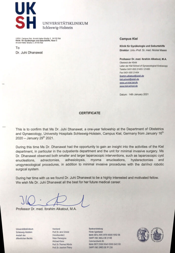 I did my Fellowship under Professor Ibrahim Alkatout, director of Kiel school of Gynaecology Endoscopy, Germany. I had the privilege of working with Prof. Alkatout, assisting him in Laparoscopic and Robotic surgeries and doing good scientific research on Gynaecology Endoscopy. I regard him as my mentor in minimal invasive gynaecology surgery and under his mentorship, I’ve flourished academically. He opened my eyes to the pandemic of chronic pelvic pain, and the utility of Neuropelveology. Together we studied pelvic anatomy and physiology in depth, and hope to expand our horizons with neuropleveology.