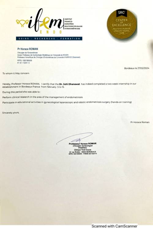 I have also worked with Prof. Horace Roman and Dr. Benjamin Merlot at IFEM ENDO, France. Under their guidance, I received training in laparoscopic and robotic endometriosis surgery.